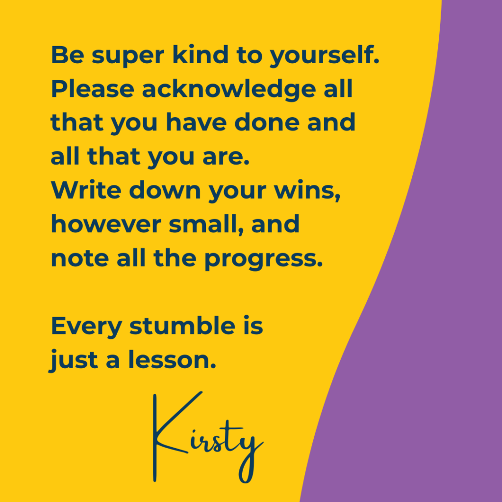Be super kind to yourself. Please acknowledge all that you have done and all that you are. Write down your wins, however small, and note all the progress. Every stumble is just a lesson.