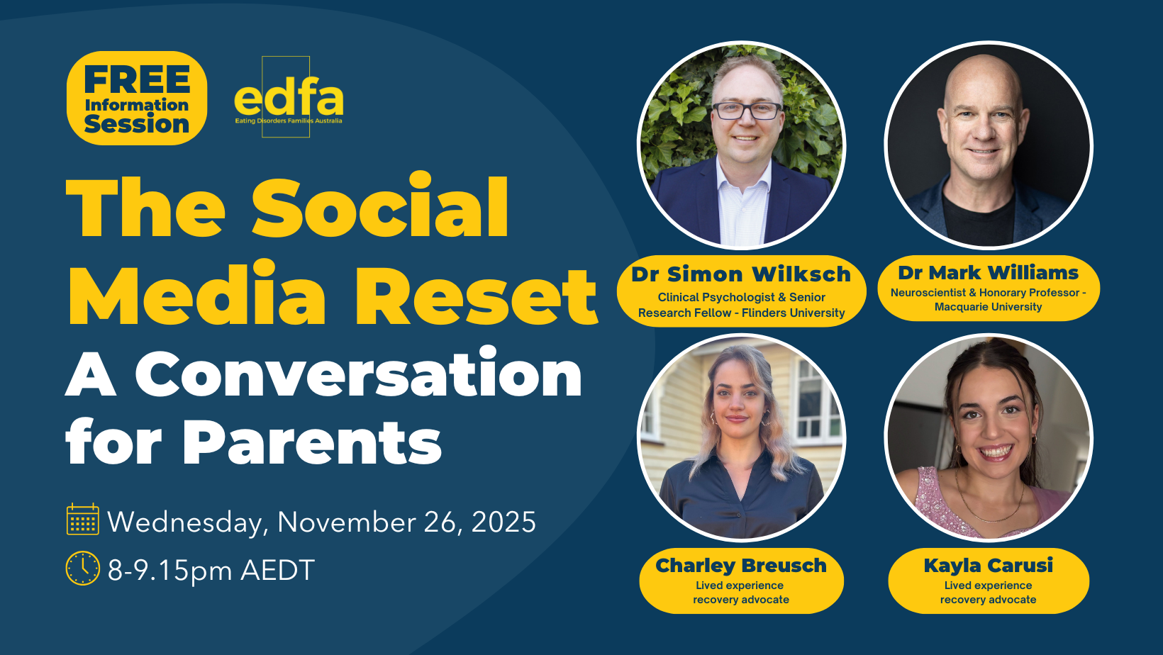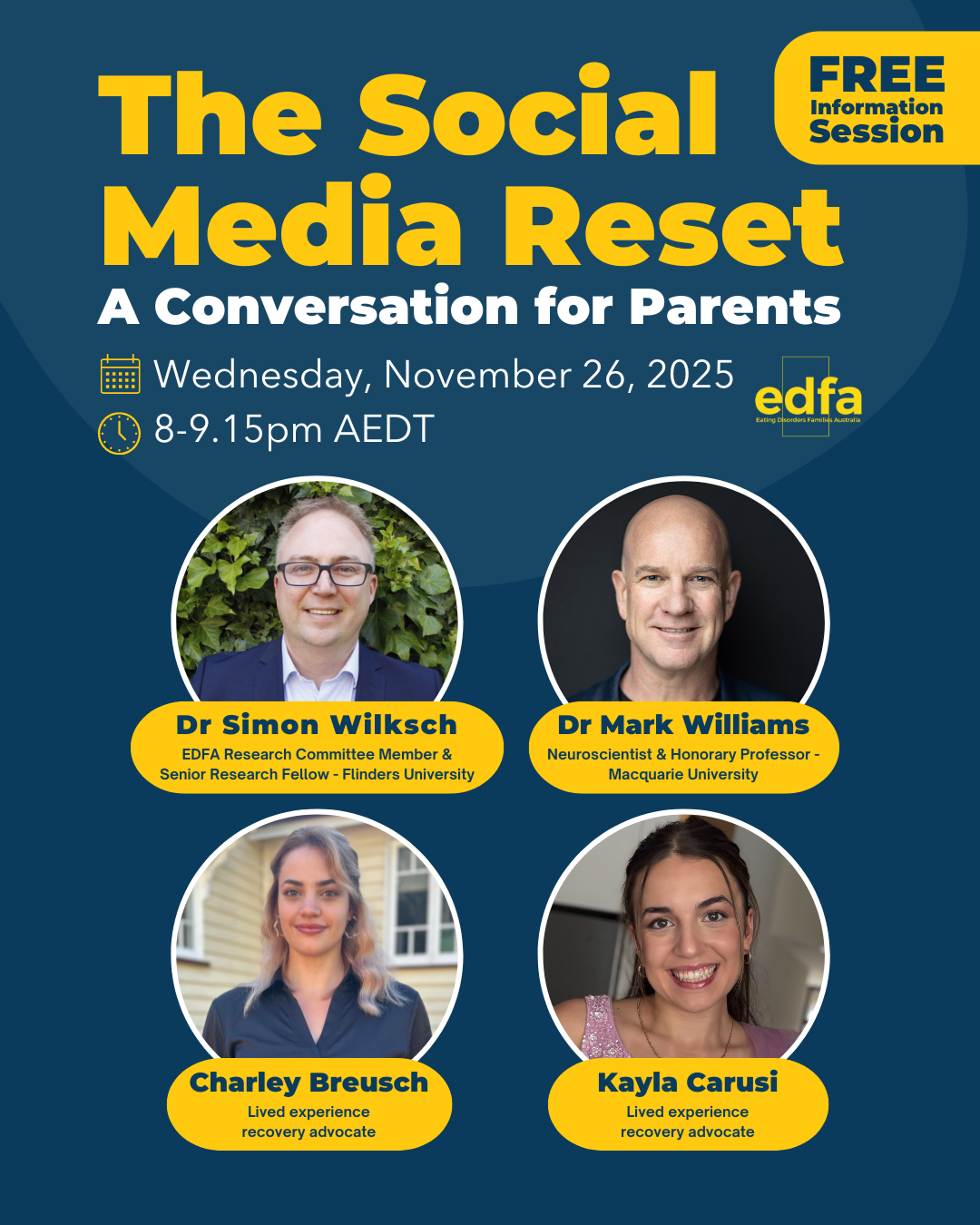 This FREE essential Information Session will feature a panel of a neuroscientist and a researcher, along with lived-experience advocates who will break down the upcoming changes to social media legislation, discuss why the reform is essential, particularly for those with eating disorders, how parents can support their child through the changes.